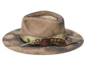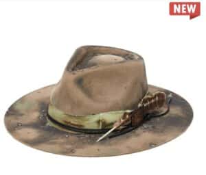 De Abel-hoed uit de Stampede-collectie bestaat uit een combinatie van materialen, waaronder wolvilt, polyester lint en een inzetstuk met veren. De hoed wordt geaccentueerd met een turquoise juweelgesp en suède akkoord, wat zorgt voor een stijlvolle en veelzijdige look. De 7,5 cm platte rand voegt een vleugje elegantie toe aan dit tijdloze stuk.