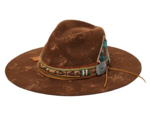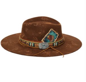 Zie er op je best uit met de Apache-hoed, onderdeel van de Stampede-collectie. Deze stijlvolle hoed is gemaakt van wolvilt, heeft een echt leren band met een ingewikkeld ontwerp en is versierd met een turquoise stenen gesp en een Apache-patch. Het is het perfecte accessoire voor elke gelegenheid. De platte rand van 9,5 cm wordt aangevuld met een suΓΒ¨dekoord, waardoor dit een modieuze en duurzame keuze is.