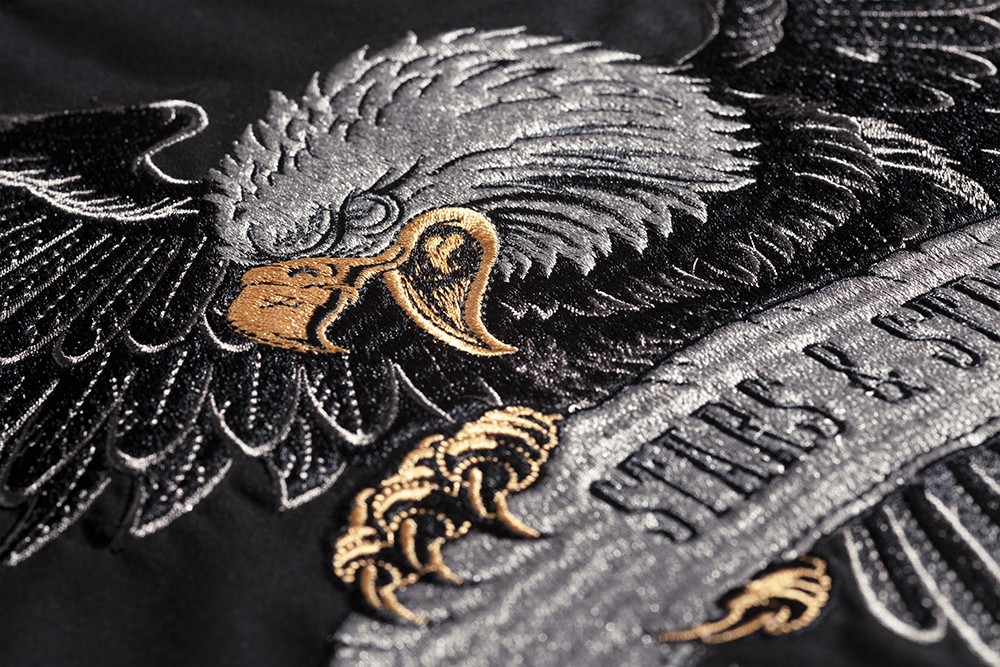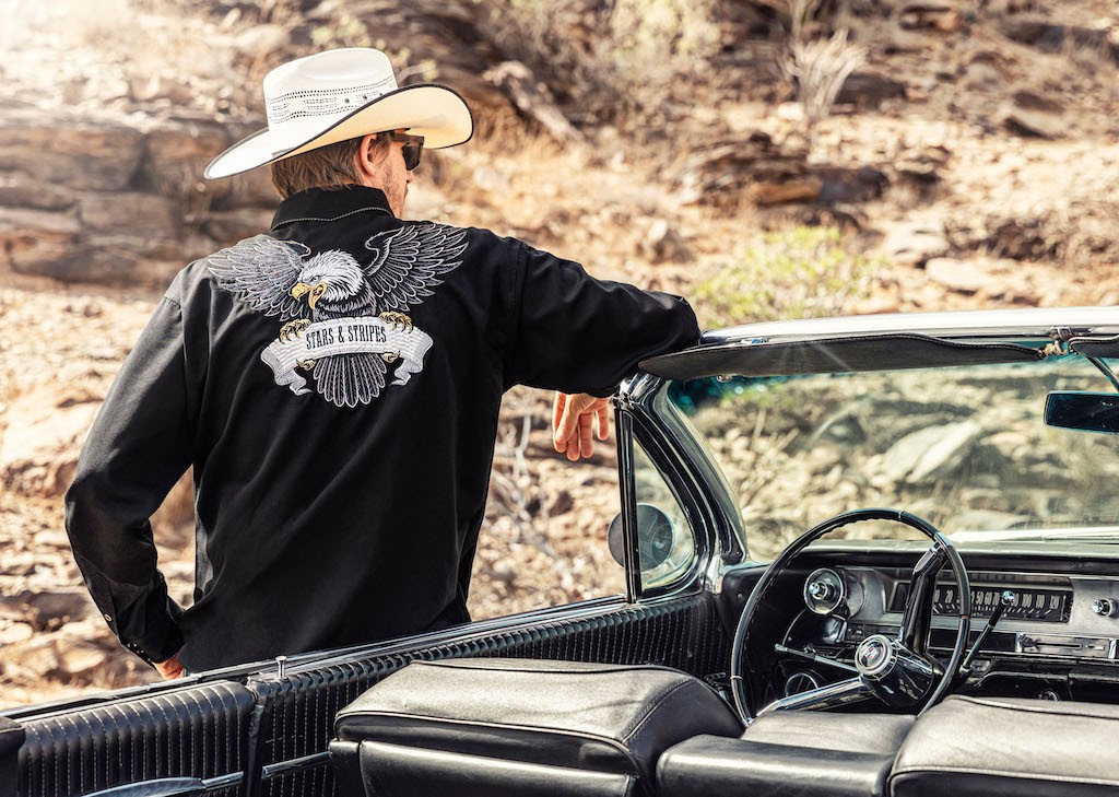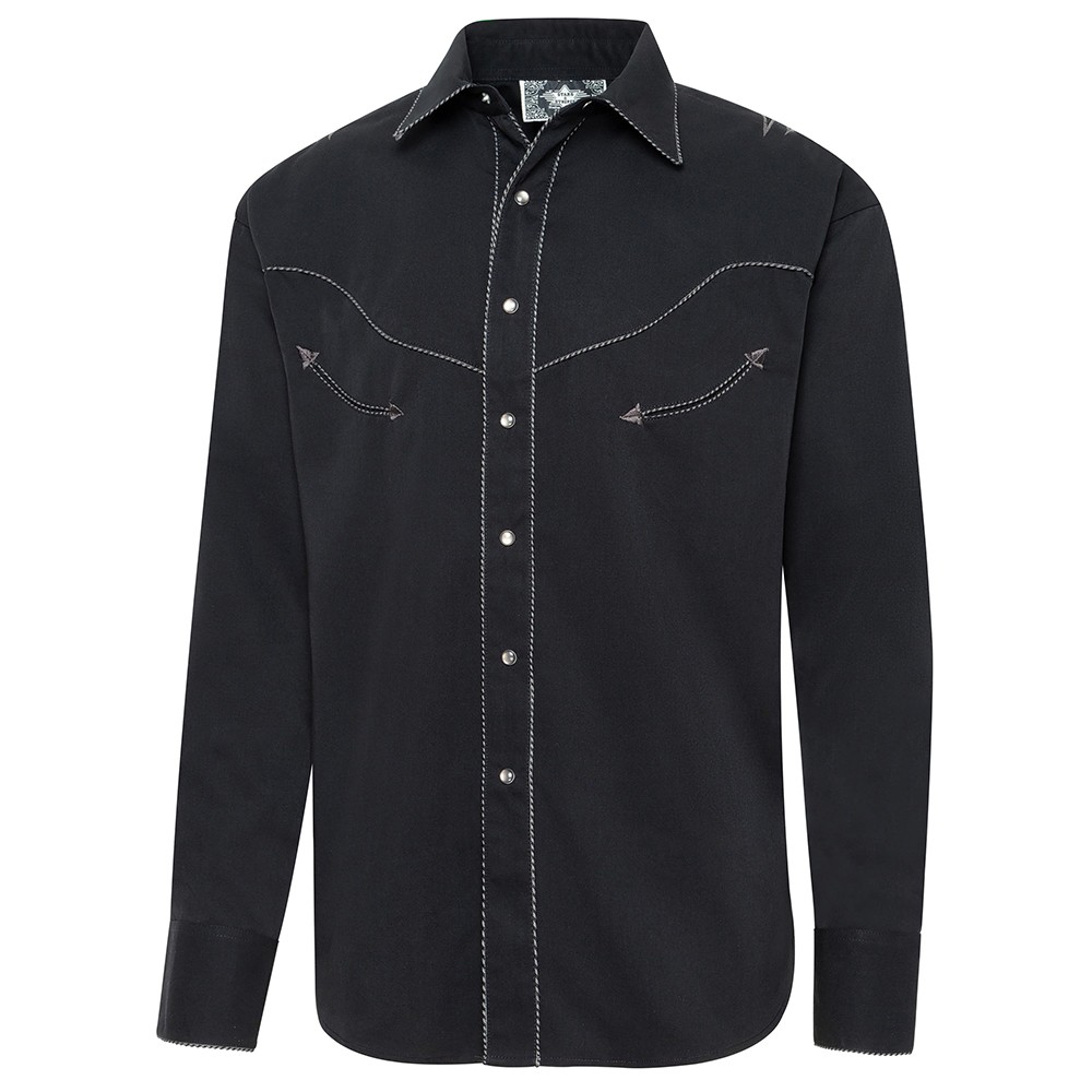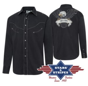 Prachtig zwart westernshirt met een grote, rijk geborduurde adelaar op de rug. Harmonisch op elkaar afgestemd met tweekleurige koordbies, smileyzakken, drukknopen en manchetten met vier knopen.