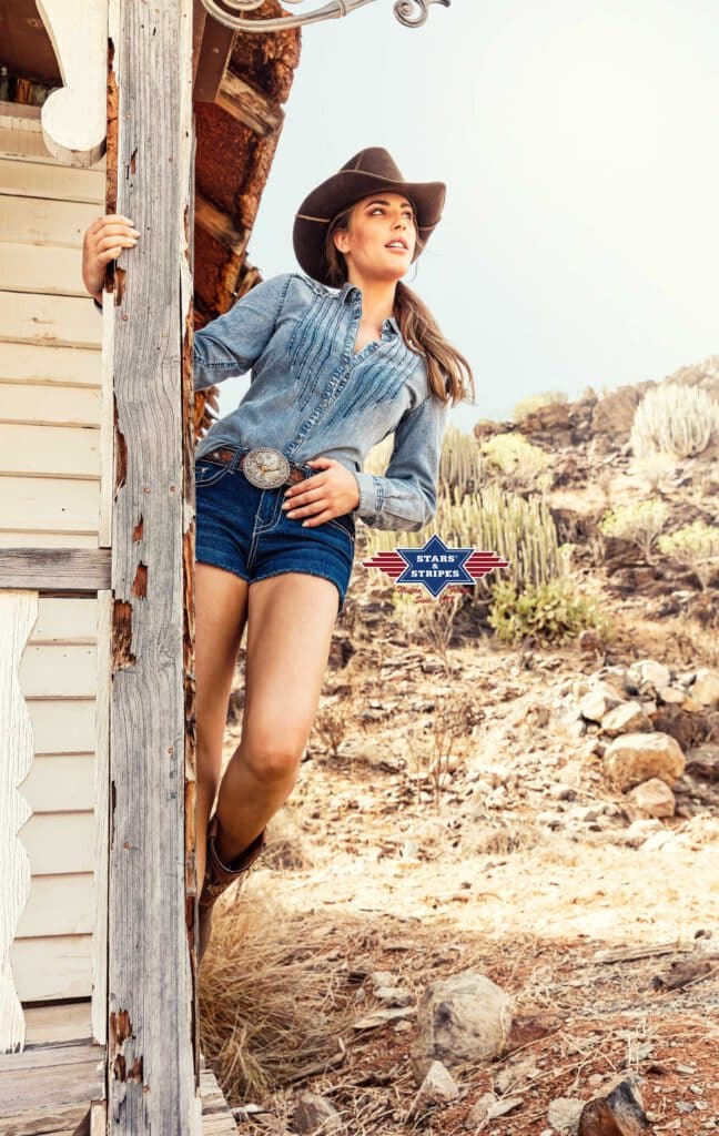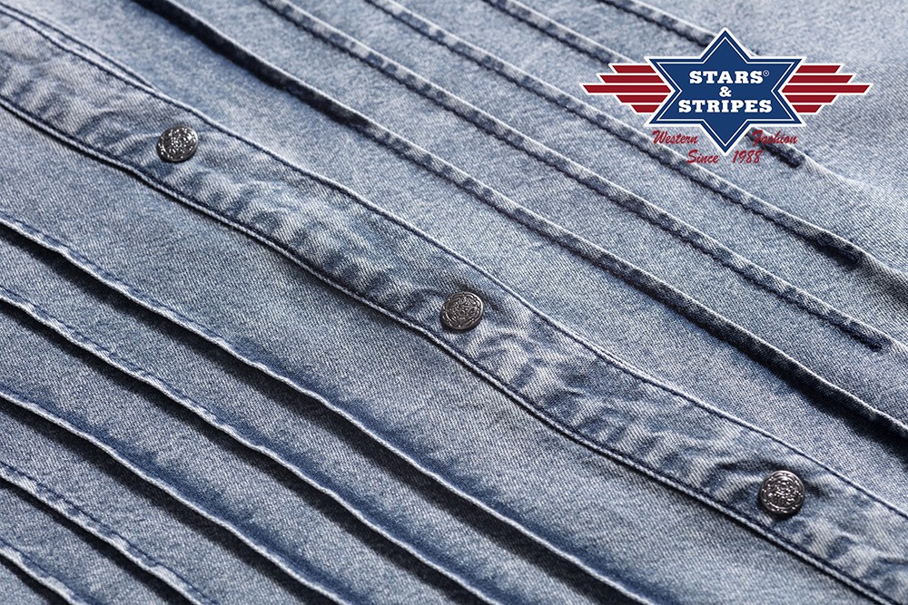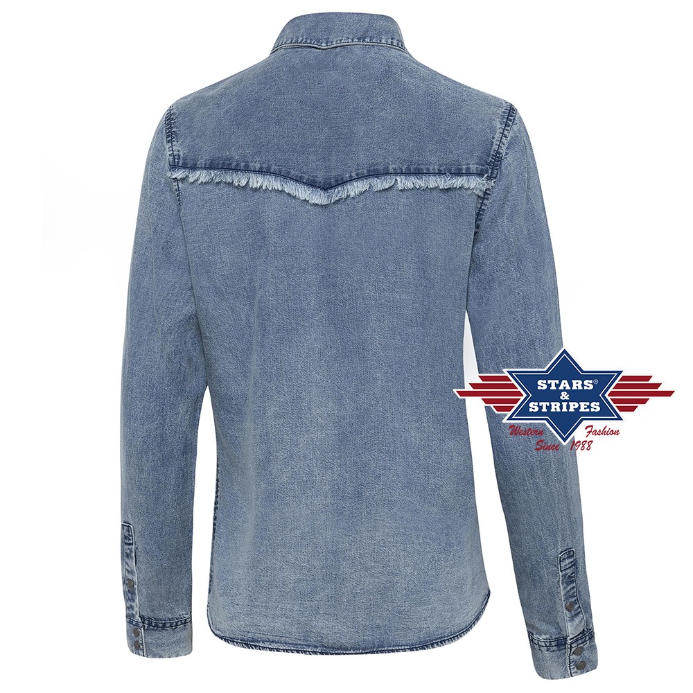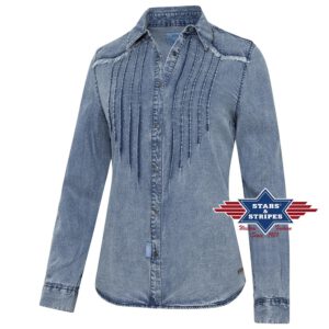 Deze zacht vallende spijkerblouse met bijzondere biezen en een licht gerafelde spijkerpas is een echte blikvanger! De aparte metalen knopen ronden deze blouse af.
