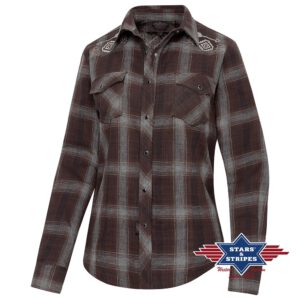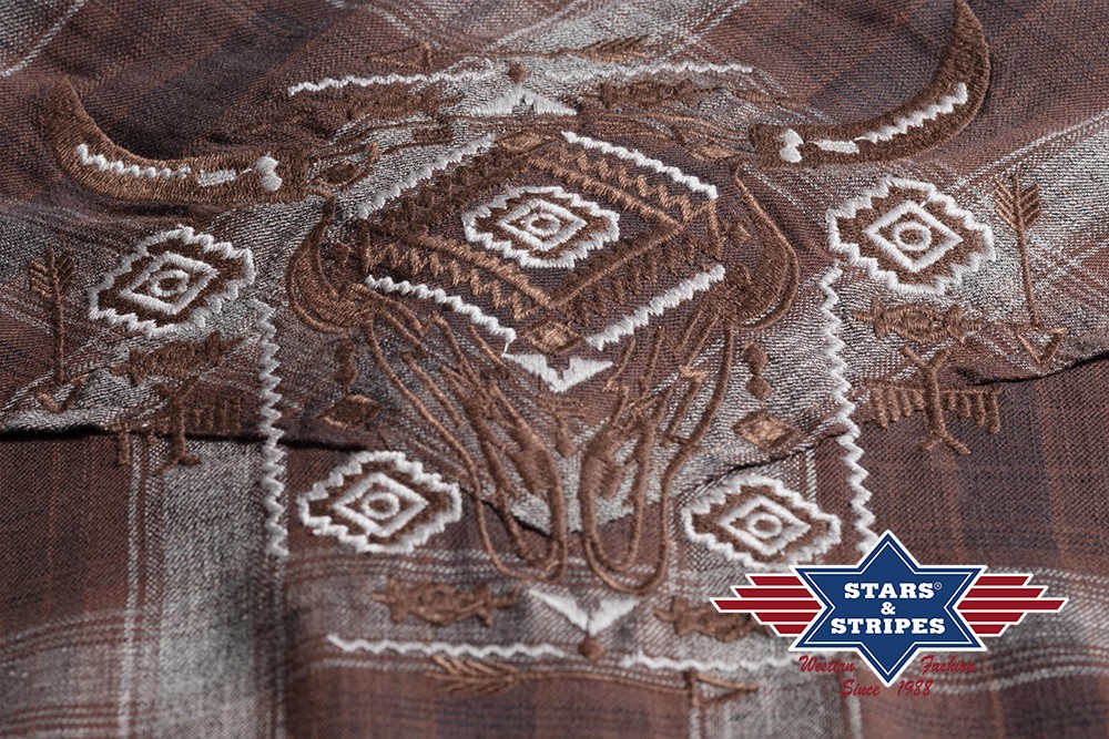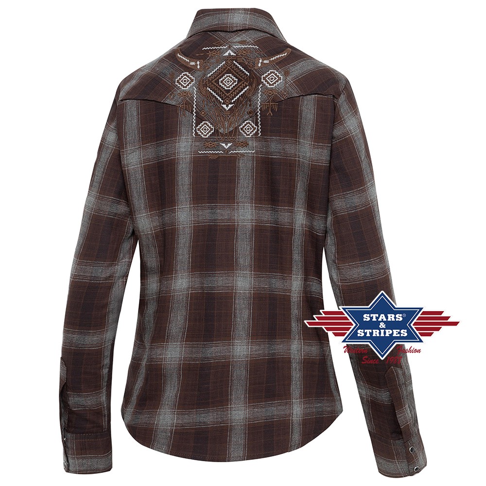 Geruite westernblouse met uitgewerkte, effectieve Azteekse borduursels op de voor- en achterkant. De opgestikte borstzakken, het subtiele westernjoke op de rug en de elegante drukknopen maken het overhemd tot een echt hoogtepunt.