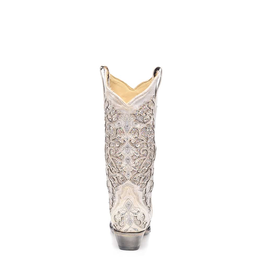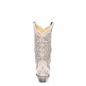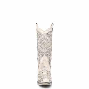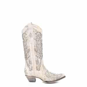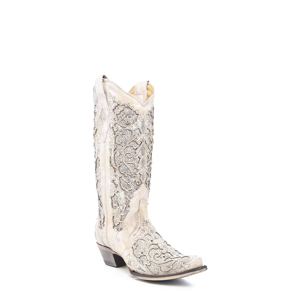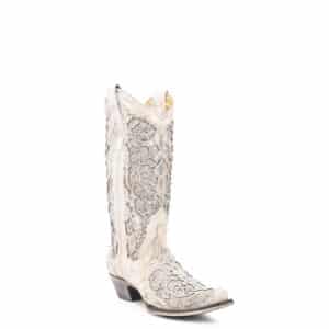 De witte Corral boots zijn een opvallende verschijning met hun gedetailleerde en glinsterende versieringen. Ze hebben een klassieke cowboylaarsvorm met een puntige neus en een schuine hak, maar worden verheven door de rijke ornamenten. De laars is voornamelijk wit of lichtgekleurd, wat een canvas vormt voor de uitgebreide, spiraalvormige en florale patronen die over de gehele schacht en voet zijn aangebracht. Deze patronen is ingelegd met zilverkleurige stiksels, studs en mogelijk zelfs kleine kristallen of glitters, wat zorgt voor een luxueuze en feestelijke uitstraling. De textuur van de laars lijkt bewerkt te zijn, wat diepte toevoegt aan het design. Ze stralen elegantie en een vleugje glamour uit, perfect voor speciale gelegenheden of om een unieke twist te geven aan een alledaagse outfit.