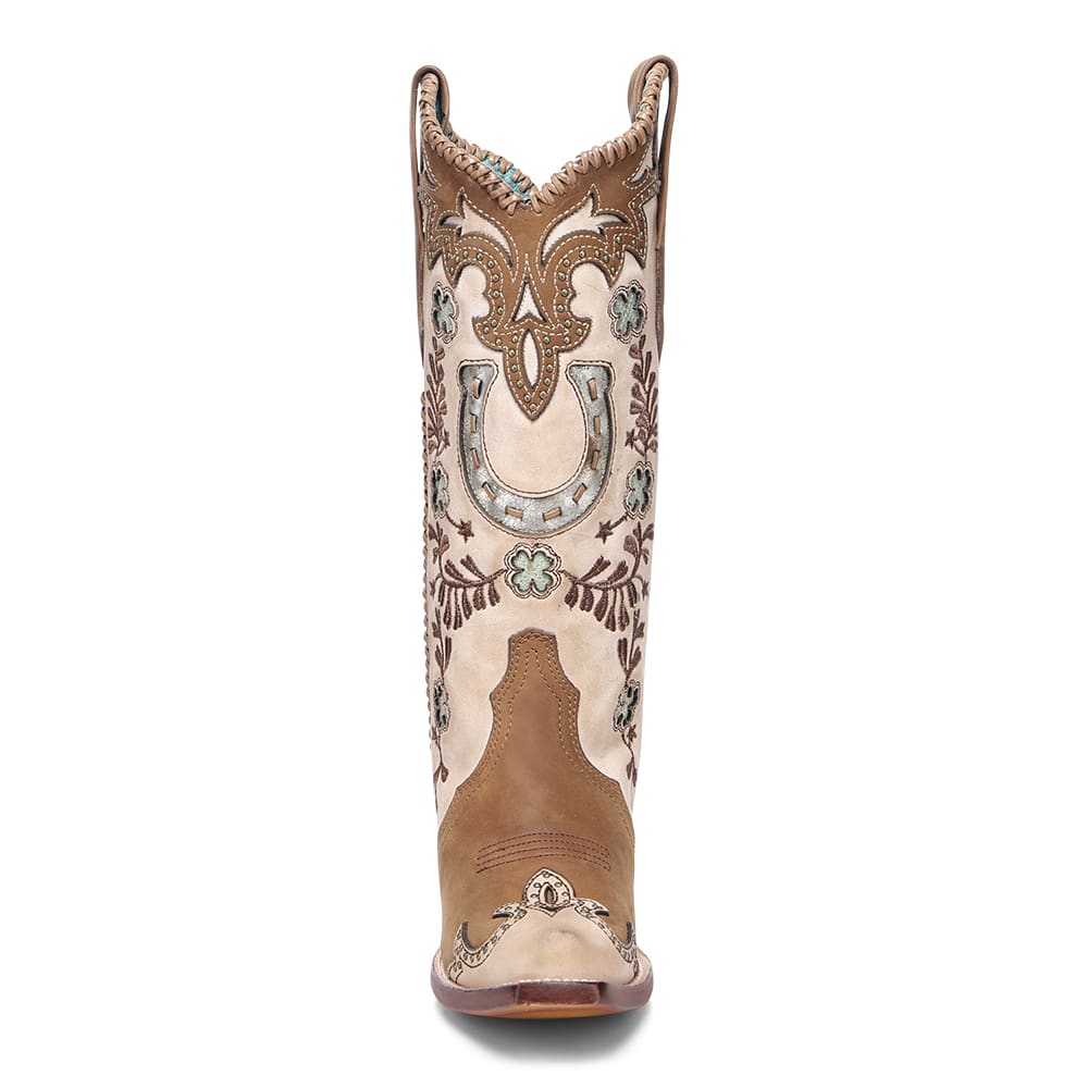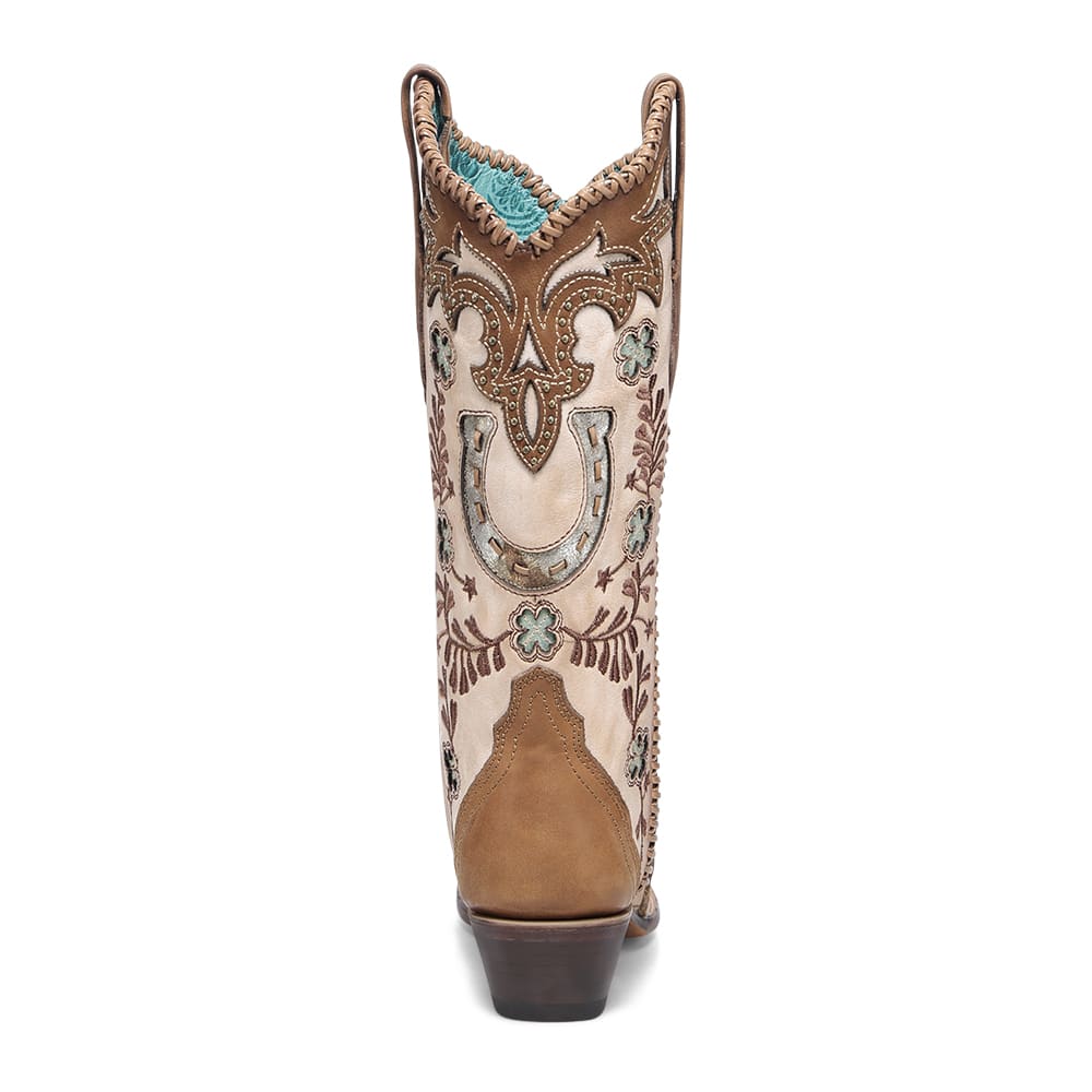 Deze schitterende dameslaars is een combinatie van luxe, finesse en echte Western charme. Het lichte leer met zand- en cognackleuren wordt prachtig aangevuld met turquoise bloemenborduursels en een groot lucky horseshoe design. Een laars die meteen opvalt door haar zachte kleuren en verfijnde details.