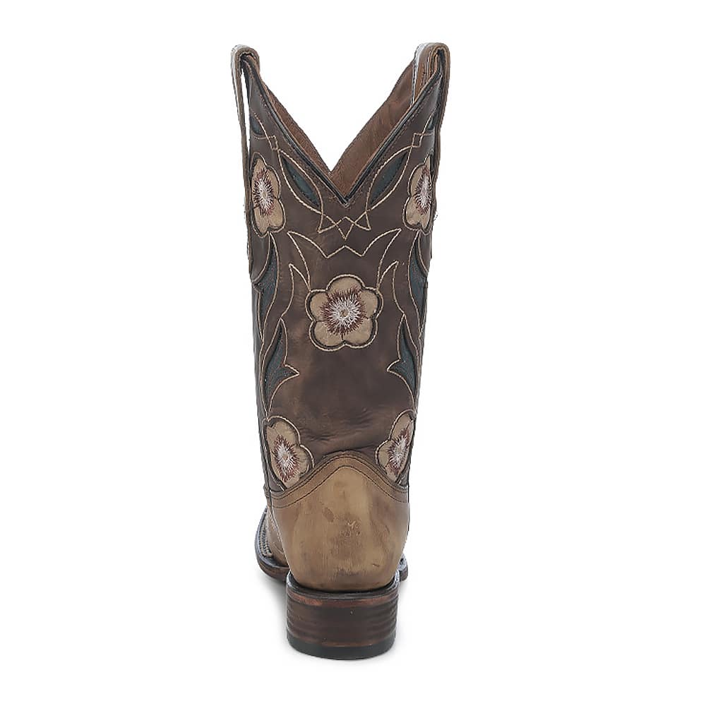Deze unieke dameslaars combineert een zachte sand–brown foot met een rijk versierde donkerbruine schacht vol prachtige bloemenapplicaties en stijlvolle bladeren. Een echte Western eyecatcher met een vrouwelijke twist.
