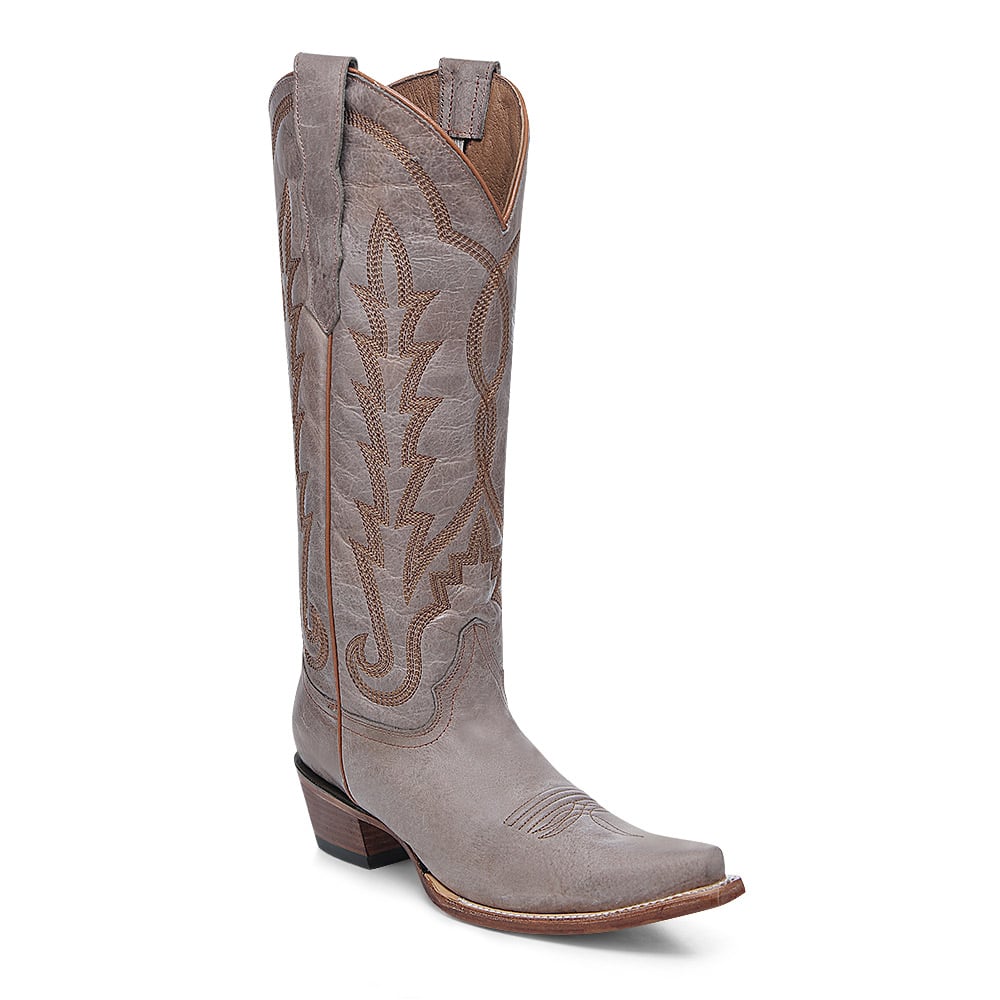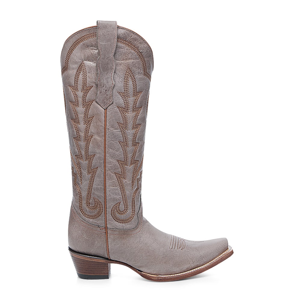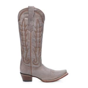 Stap stijlvol het Westen in met deze elegante Corral dameslaars in een unieke grijze bruine tint. De laars is met de hand vervaardigd van hoogwaardig rundsleer en afgewerkt met verfijnde westernstiksels op de schacht en wreef. De klassieke snip toe (puntneus) en de houten cowboyhak geven deze laars een authentieke look met moderne flair.