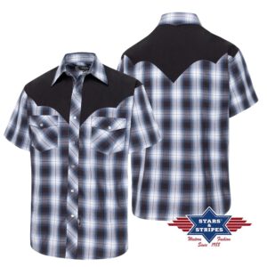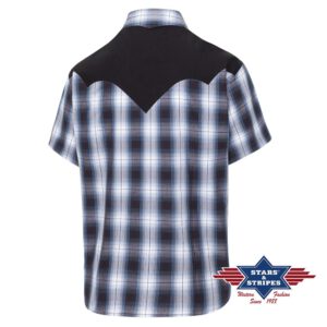 Dit westernoverhemd met korte mouwen overtuigt met een opvallend ruitpatroon in blauw- en bruintinten, gecombineerd met een zwarte westernyoke op de schouders. De klassieke opgestikte borstzakken en drukknopen onderstrepen de authentieke westernlook. Met zijn casual maar toch stijlvolle ontwerp is het de perfecte keuze voor warme dagen en casual outfits.