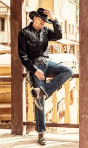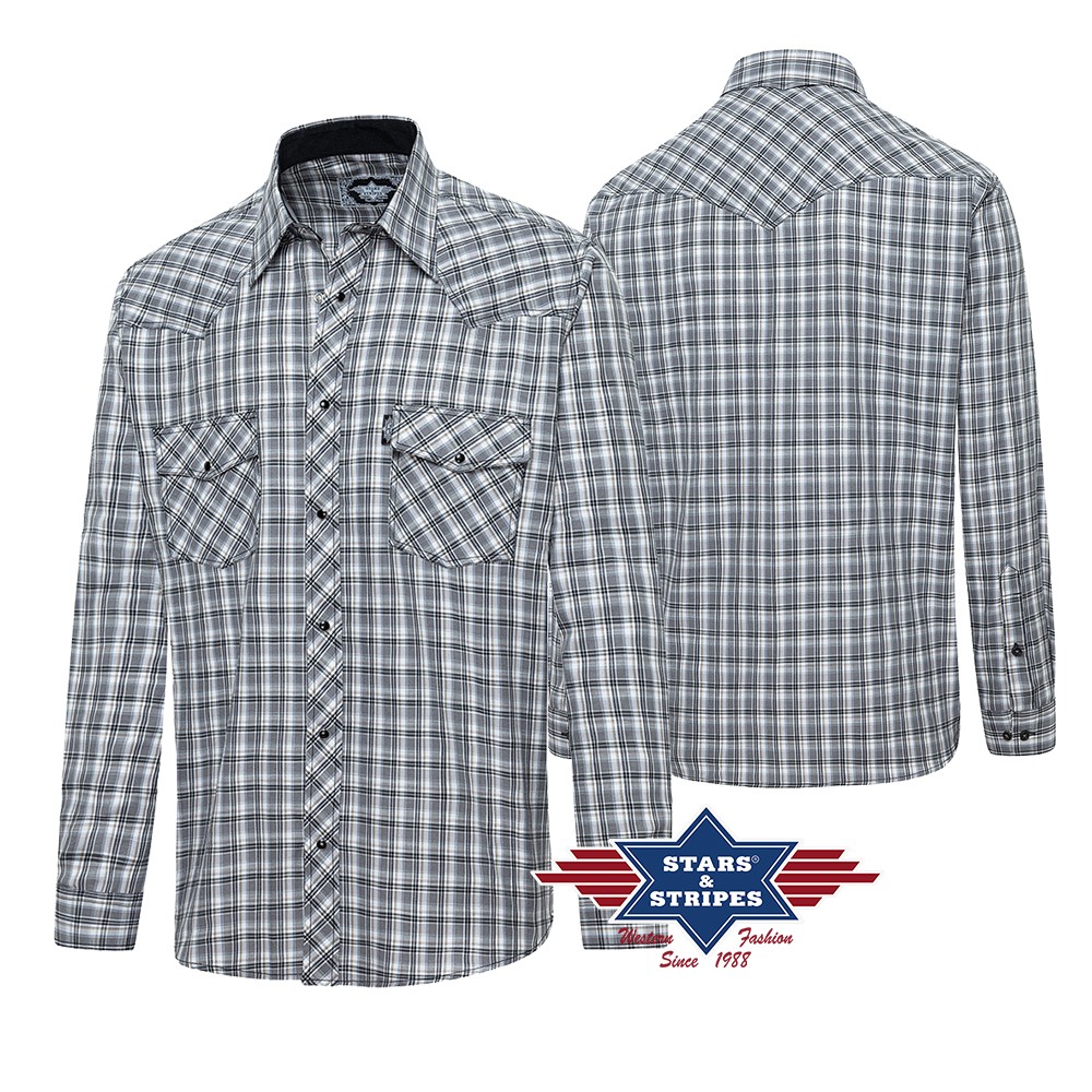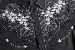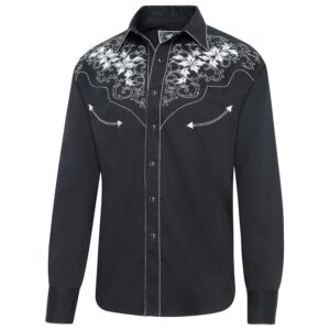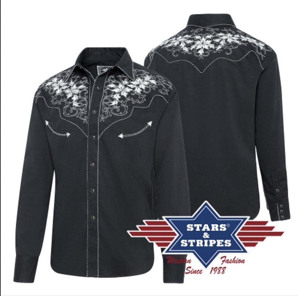 Prachtig westernshirt met geweldig borduursel op borst en rug. Harmonisch gecoördineerd met tweekleurige koordbies en manchetten met drie knopen.