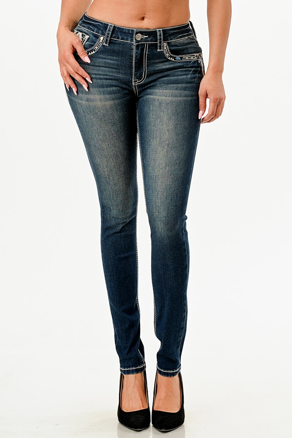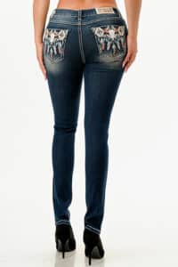 Dames skinny jeans met op de zakken afgewerkt met skull en geborduurde veren.