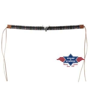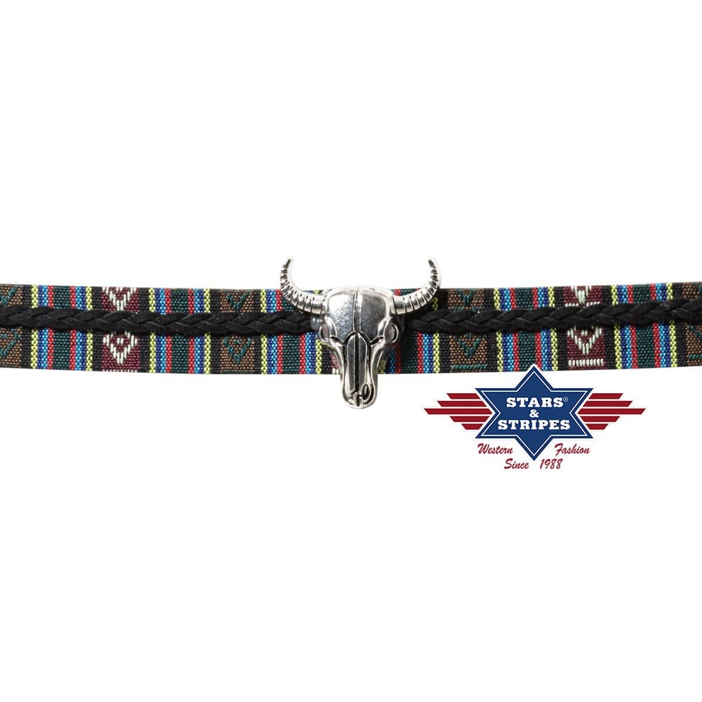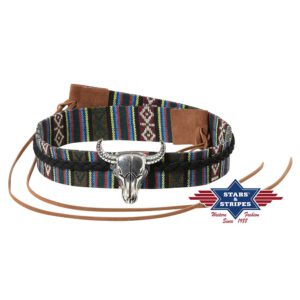 Decoratieve geweven hoedband met gevlochten lederen band en een zilveren doodshoofd als absolute blikvanger
