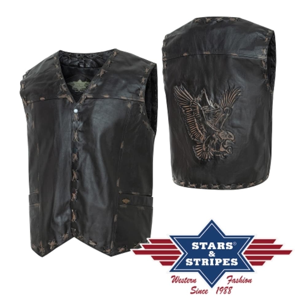 Westernvest van rundleer met antieke optiek, naden versierd met kruissteken en adelaarsappliqué op de rug. Twee buiten- en één binnenzakken.