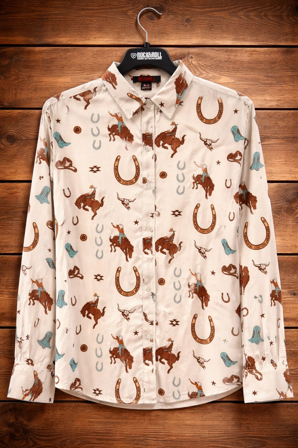 Dit unieke western shirt van Rock & Roll Denim is een echte eyecatcher voor liefhebbers van de echte cowboy lifestyle. De lichte basis wordt gecombineerd met een speelse all-over print van cowboys, hoefijzers, boots en western details.