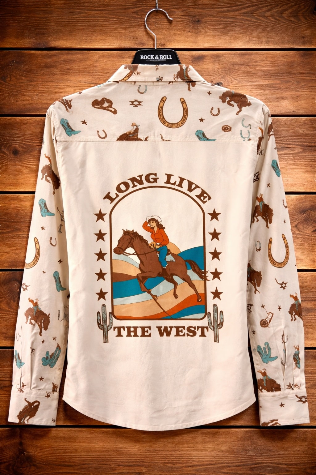 De achterkant maakt dit shirt extra bijzonder met de grote “Long Live The West” print, geïnspireerd op het klassieke western leven. Een perfecte mix van stijl en karakter.