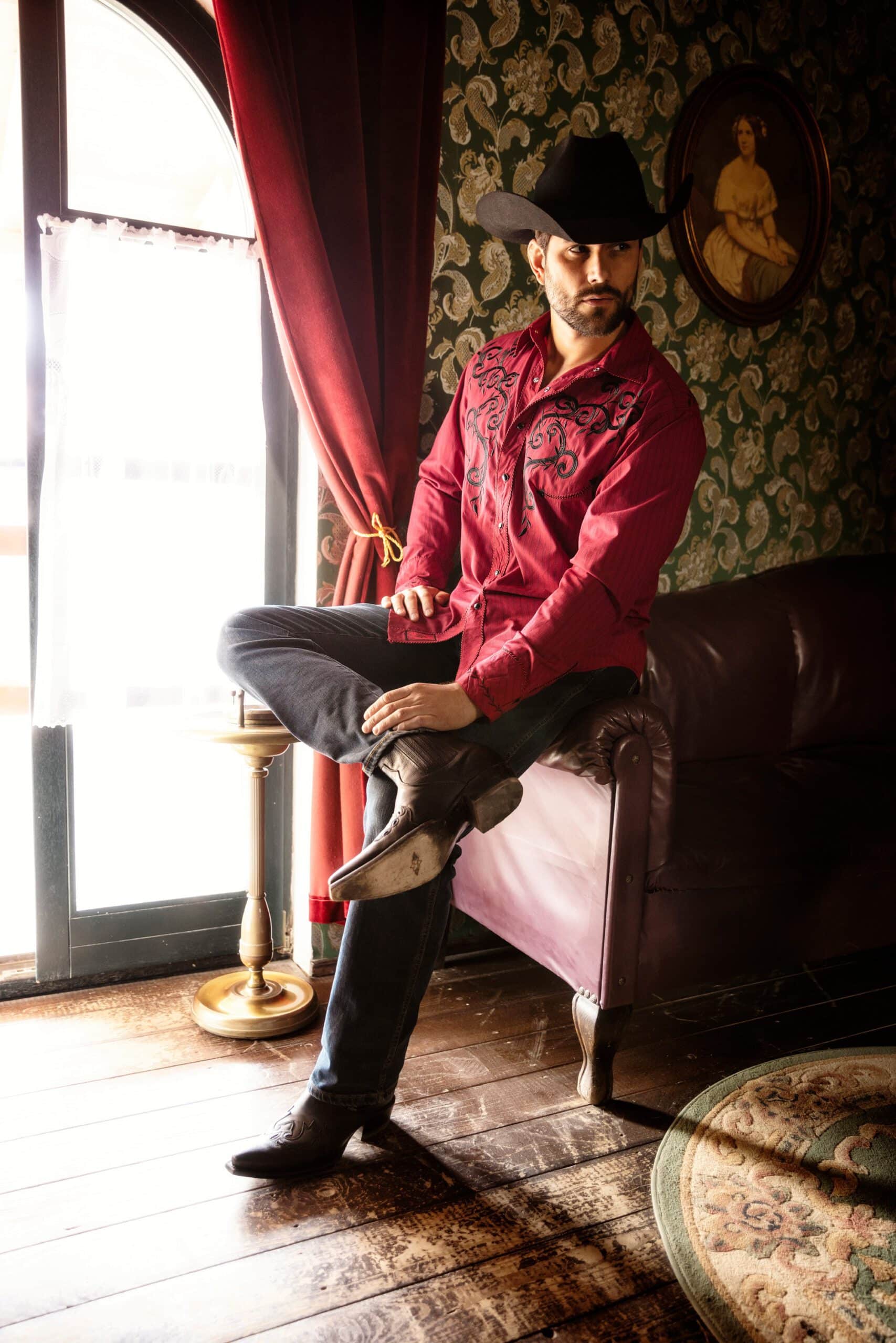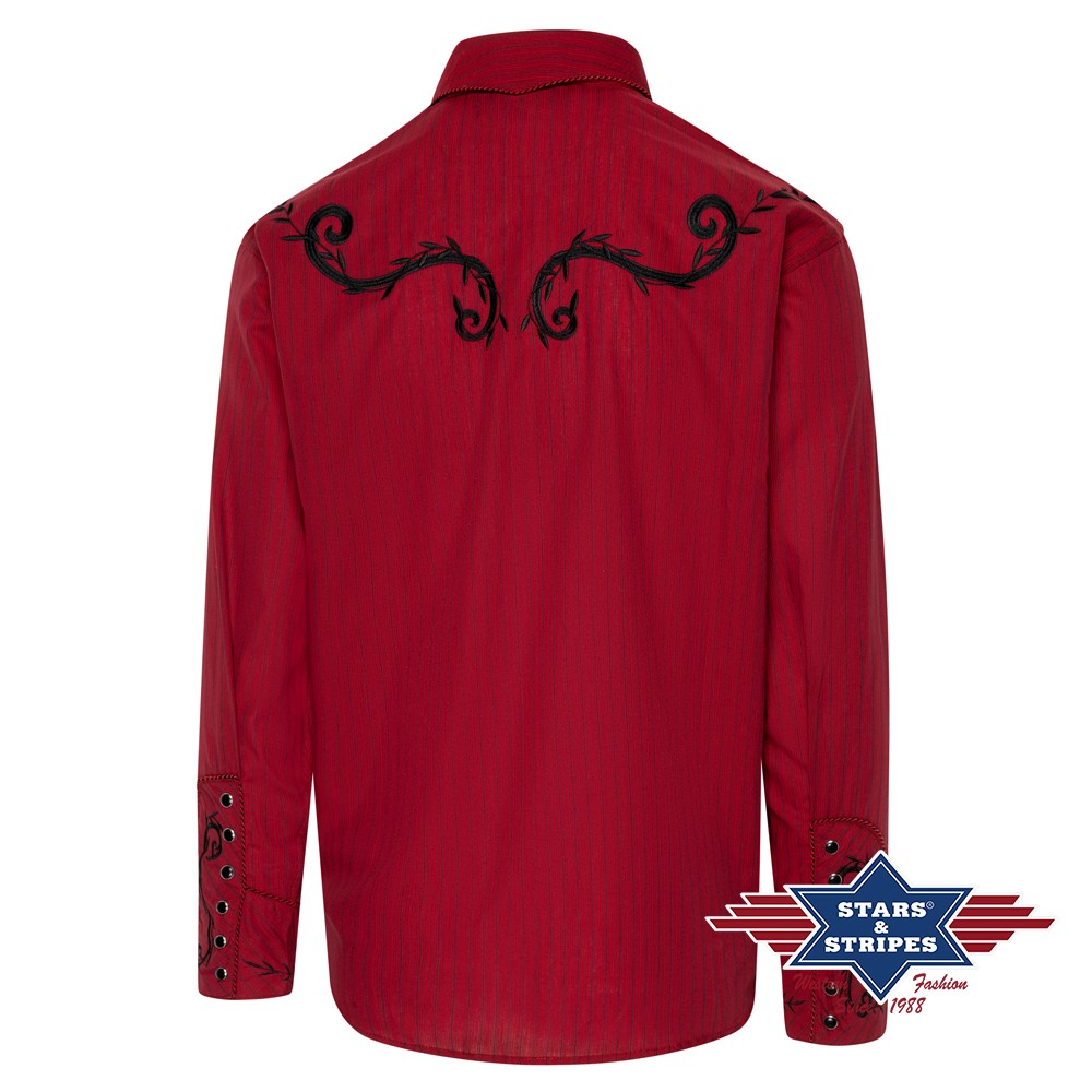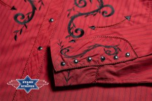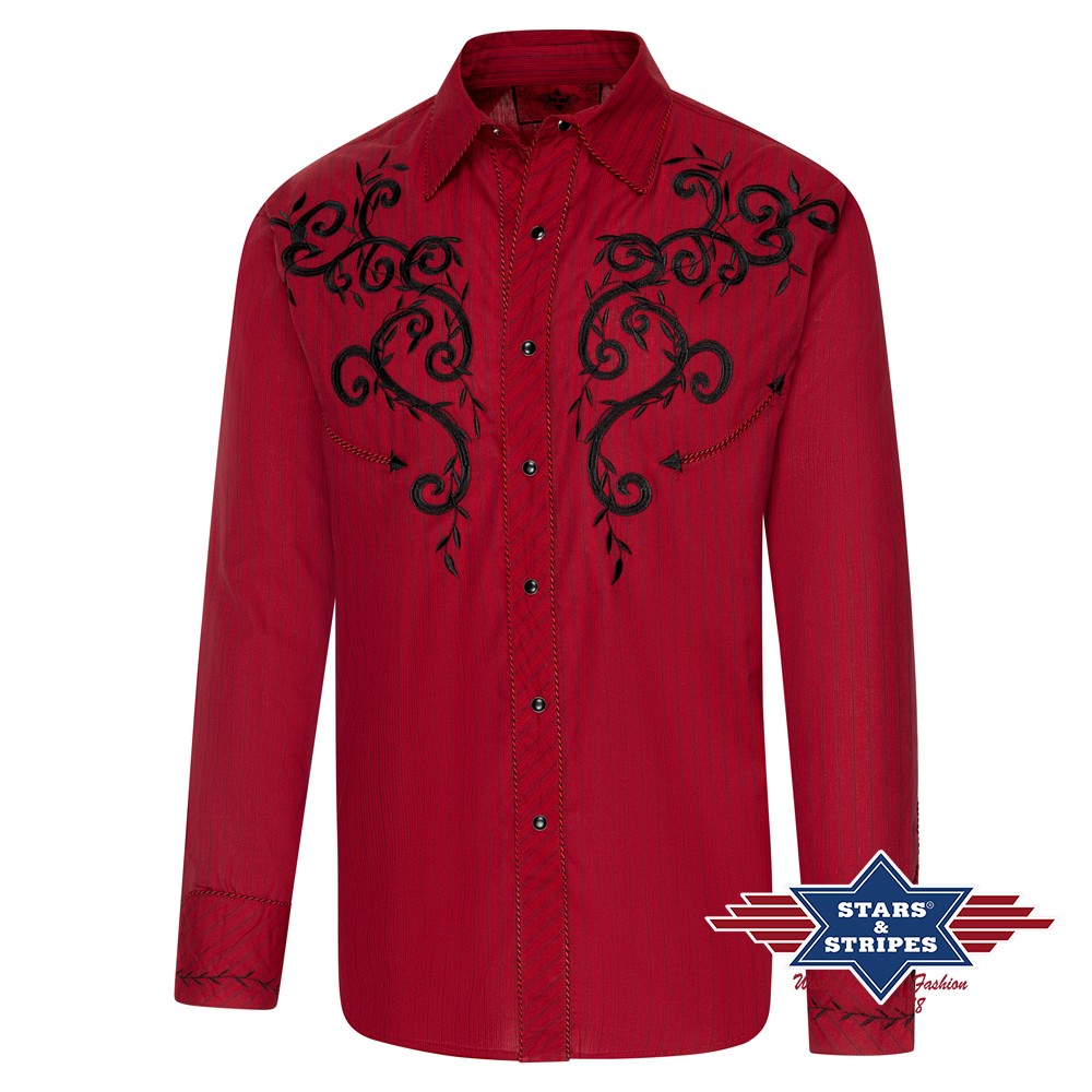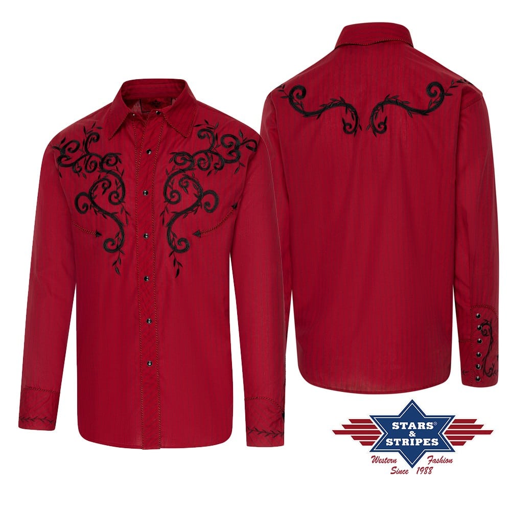 Prachtig westernshirt met prachtig borduursel op de borst en rug. De westernmanchetten, knoopsluiting en kraag zijn afgebakend door een tweekleurige koordbies. De functionele smileys-pockets en de manchetten met zes knopen weerspiegelen de klassieke westernmode. Het shirt combineert een onderhoudsvriendelijke structuur met een op maat gemaakte pasvorm die de robuuste elegantie van de westernstijl voor dagelijks gebruik opnieuw interpreteert. Past bij blouse CATHERINE