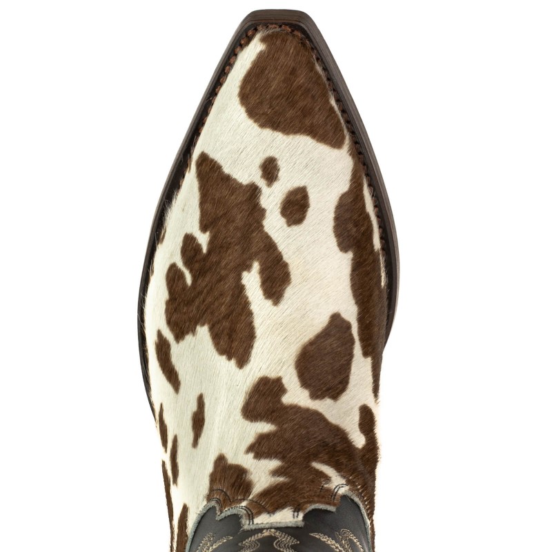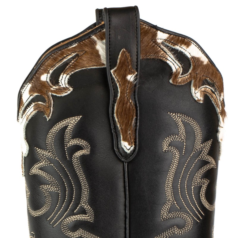 Deze laarzen zijn gemaakt van **premium echt leer** met prachtige **natuurlijke cowhide patronen**. Elk paar is uniek door de tekening van de vacht. De zwarte schacht met verfijnd stikwerk geeft de laars een luxe uitstraling en maakt hem moeiteloos te combineren met jeans, dresses of een complete Western outfit.