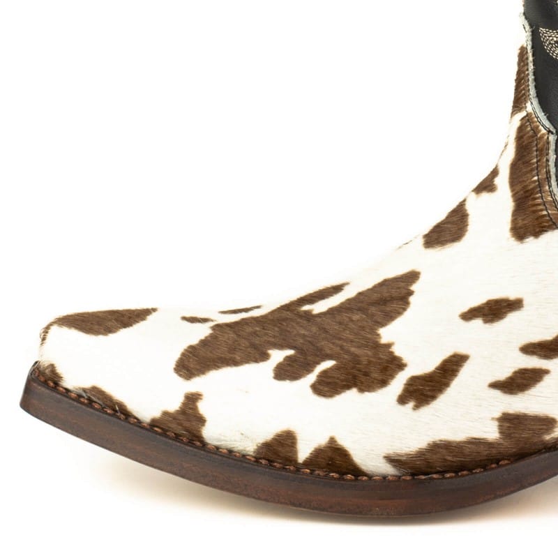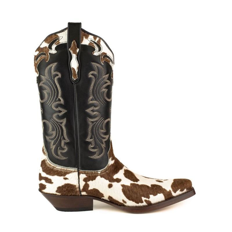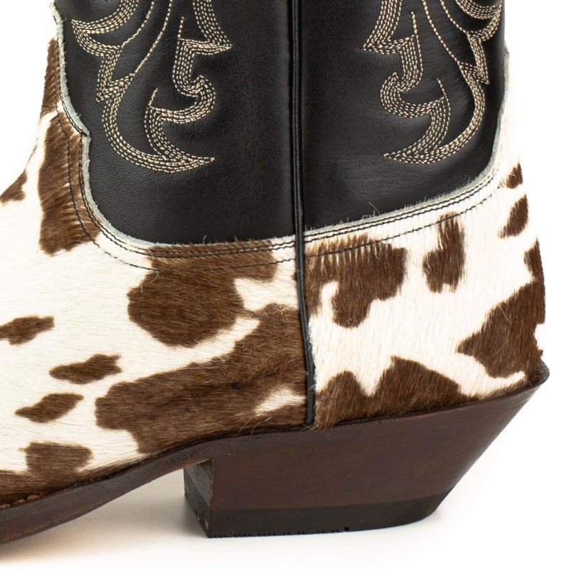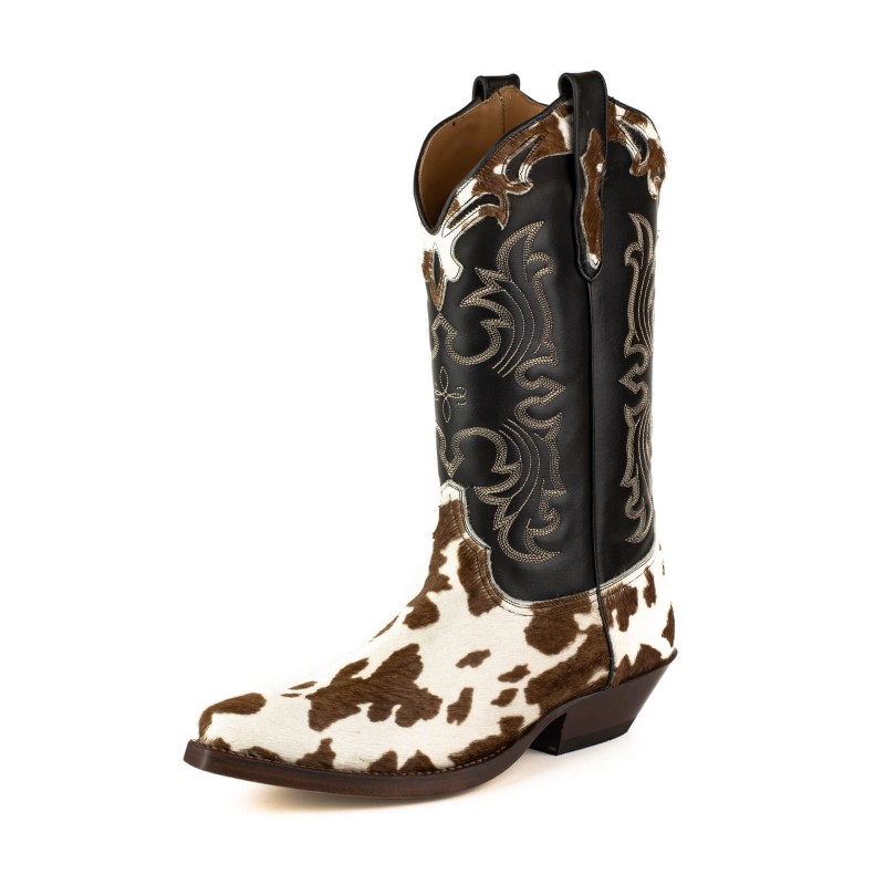 Deze laarzen zijn gemaakt van **premium echt leer** met prachtige **natuurlijke cowhide patronen**. Elk paar is uniek door de tekening van de vacht. De zwarte schacht met verfijnd stikwerk... Lees meer