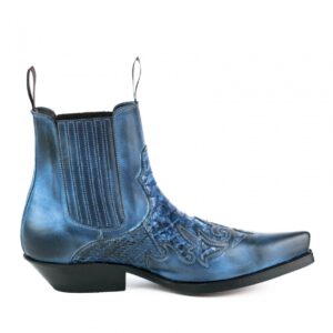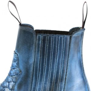 Dit model, 2500 Rojo Blue, is van het merk Mayura. Deze heren laarzen zijn gemaakt van een blauw kleurig leer. Ze zijn afgewerkt met een echte python op de wreef in dezelfde kleur. De neus is sierlijk uitgesneden voor een mooie afwerking. Aan de voor- en achterkant van de boots zijn treklussen aangebracht voor het gemakkelijk aantrekken. Ook is er elastiek in de schacht aangebracht waardoor hij mooi om de enkel aansluit. De neus van deze laarzen loopt spits toe. De laars is 100% leder en is volledig met de hand gemaakt. De lederen zool is volledig doorgestikt volgens de Goodyear Welt methode. De pasvorm is normaal. De schachtomvang is 28 cm, de hakhoogte is 4 cm en de totale lengte van de laars is 20 cm.