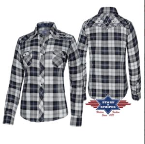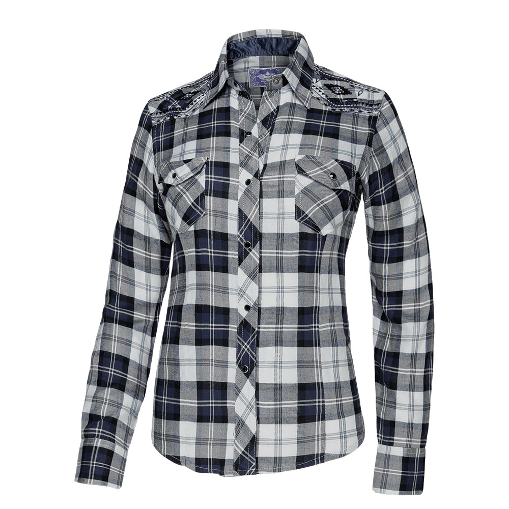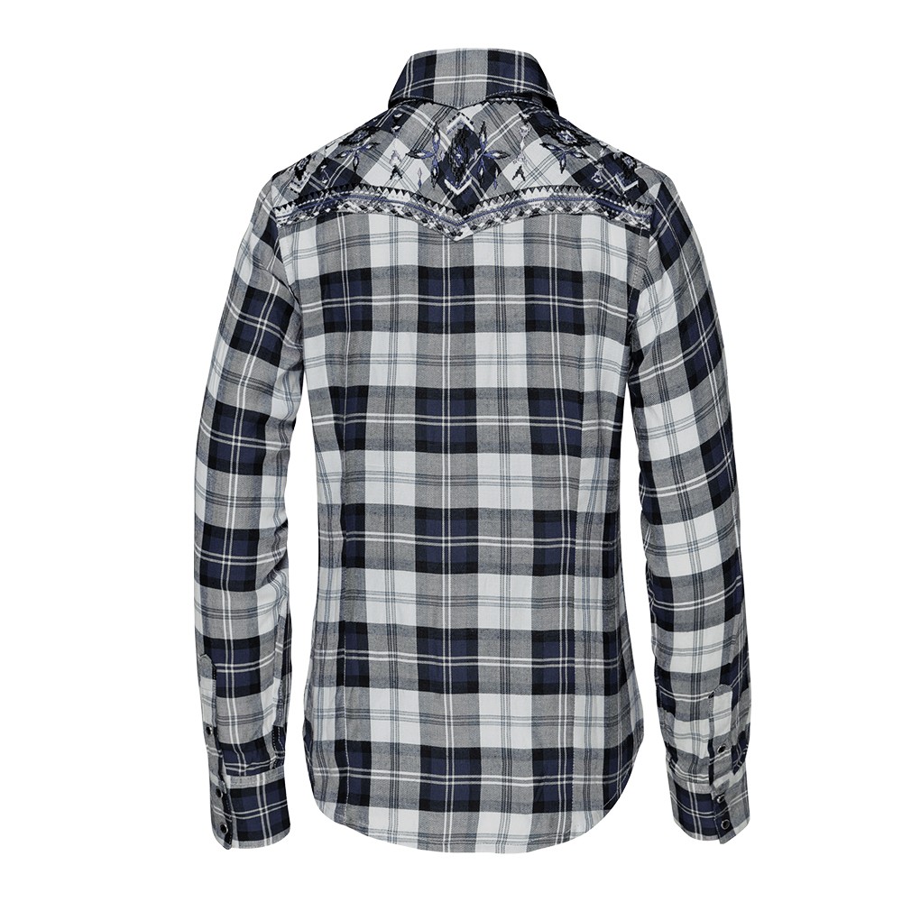 Geruite blouse met borduursel voor en achter, opgestikte borstzakken, drukknopen en satijnen bies bij de halslijn, knoopsluiting en zakkleppen en manchet.