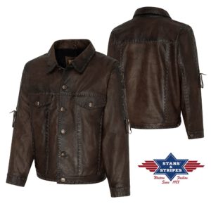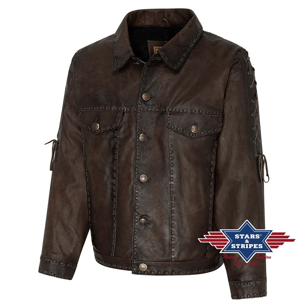 Hoogwaardige western leren jas. Zeer comfortabel om te dragen zacht rundleer. Afgewerkt met drukknopen, twee buitenzakken, aangename voering en stijlvolle vetersluiting.