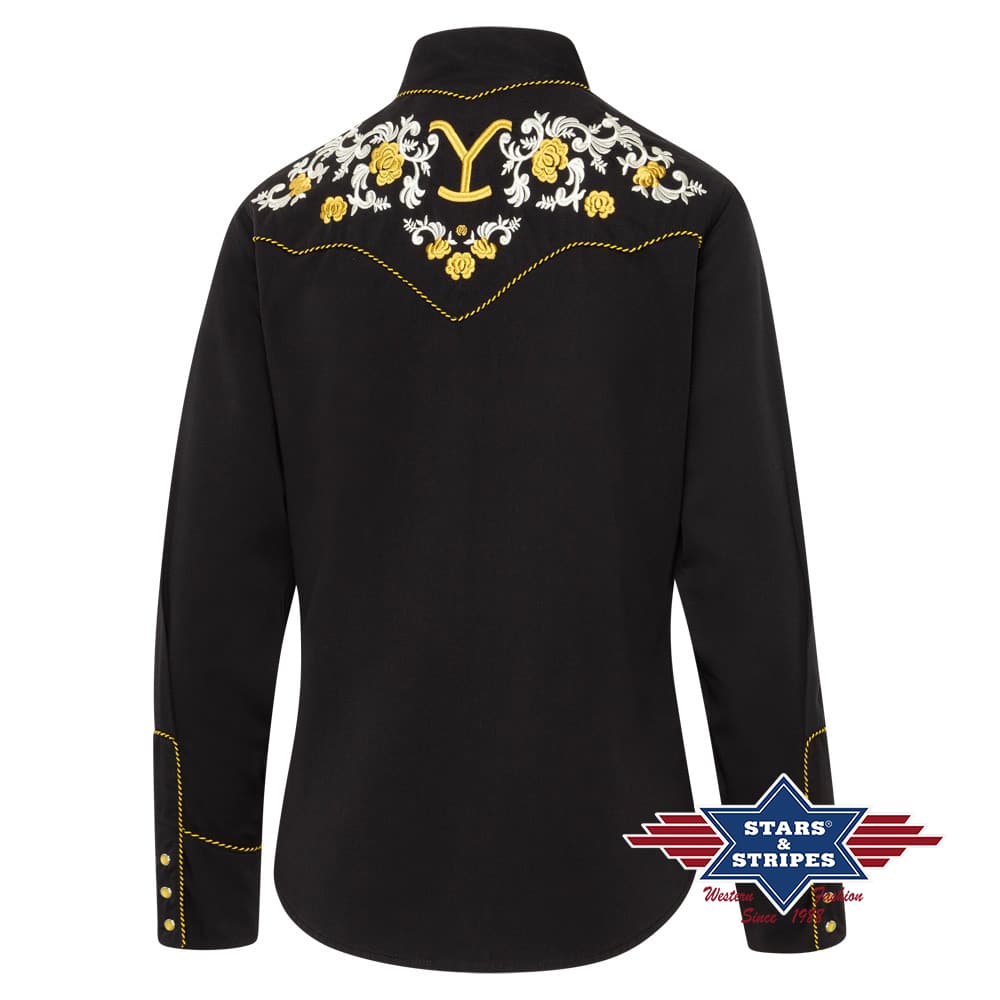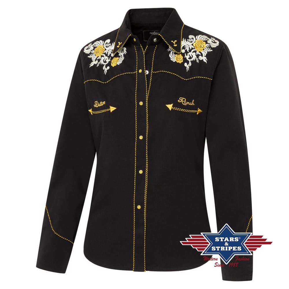 Prachtige Yellowstone Western blouse met tweekleurige borduursels op de borst en rug. De Western schouderpas wordt geaccentueerd door een tweekleurige koordbies. Faux smileys en drievoudige knoopsmanchetten weerspiegelen de klassieke Western mode. De blouse combineert een onderhoudsvriendelijke textuur met een getailleerde pasvorm die het figuur flatteert, waardoor het een echte blikvanger is – niet alleen voor fans van de Yellowstone-serie. Past perfect bij het DORIAN shirt.
