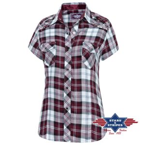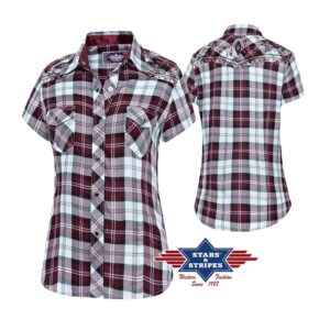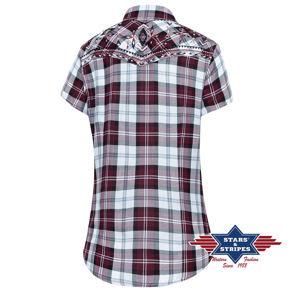 Stoere geruiten dames western shirt met op de schouder en rug geborduurde prints. Met korte mouw