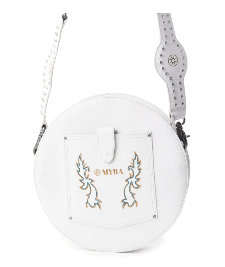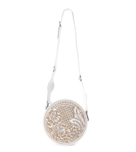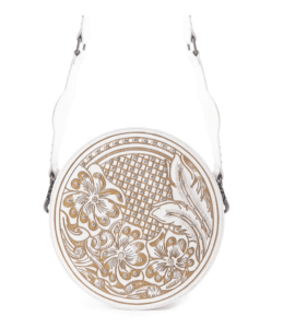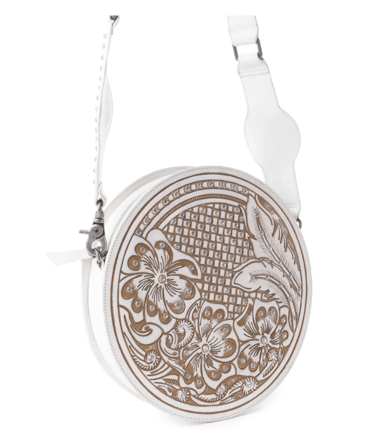 Een verblinding! Omarm woestijn elegantie met deze ronde tas schat met ingewikkelde verenversieringen en de look van met de hand bewerkte lederen kunstenaarschap op romig ivoor. Deze ronde schoudertas is perfect voor de vrijgevochten zwerver en combineert gedetailleerd westers scrollwerk met moderne woestijnchic. De kristallen met edelstenen bezaaide accenten en verouderde hardware voegen precies het juiste vleugje grensromantiek toe. Top met ritssluiting en afneembare, verstelbare schouderriem in bijpassend geaccentueerd leer.