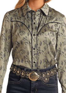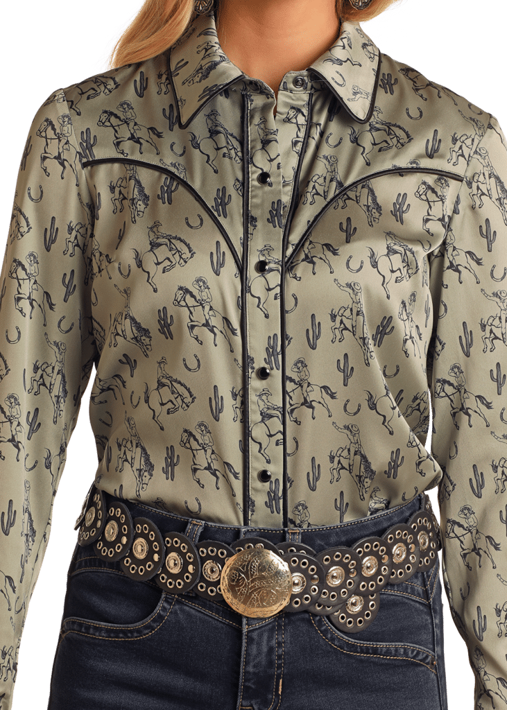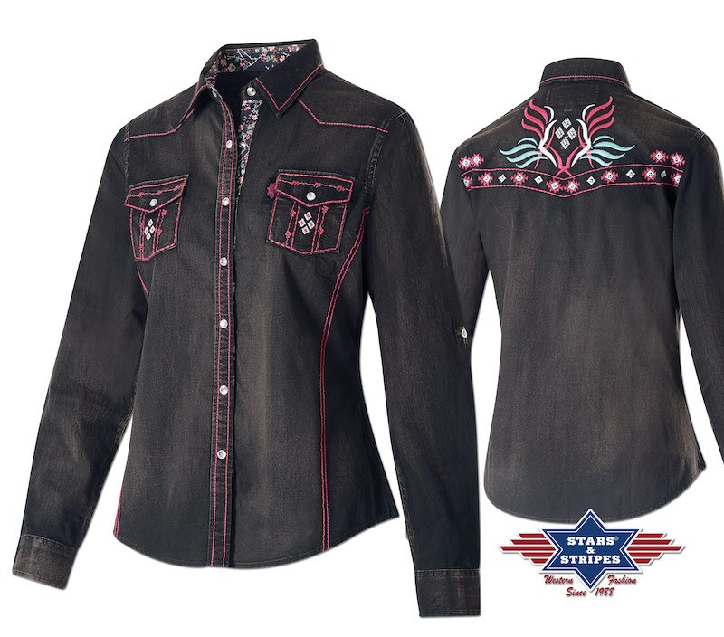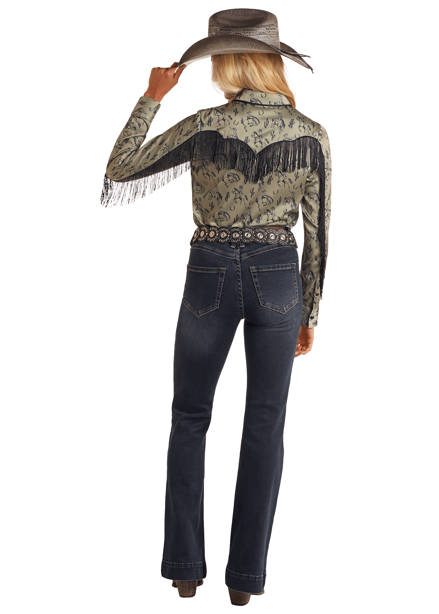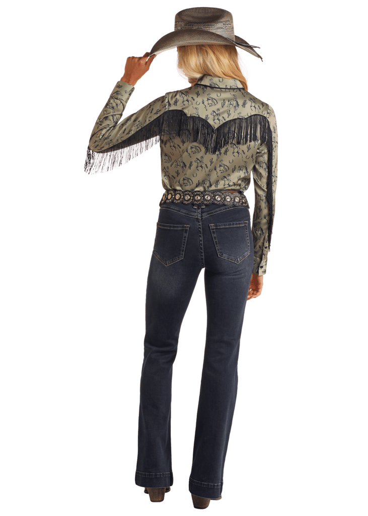 Dames western shirt met western print in satijnachtige stof met franje op mouw en rug.